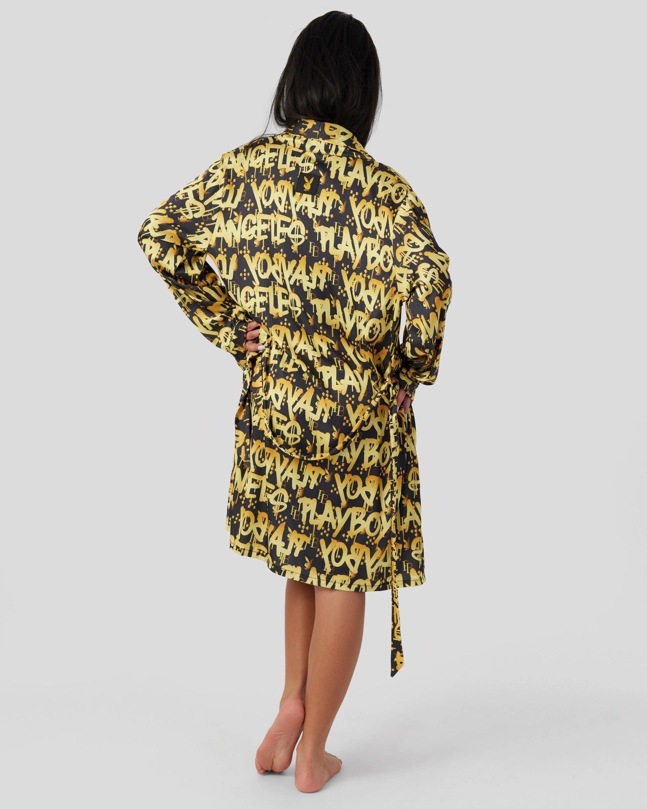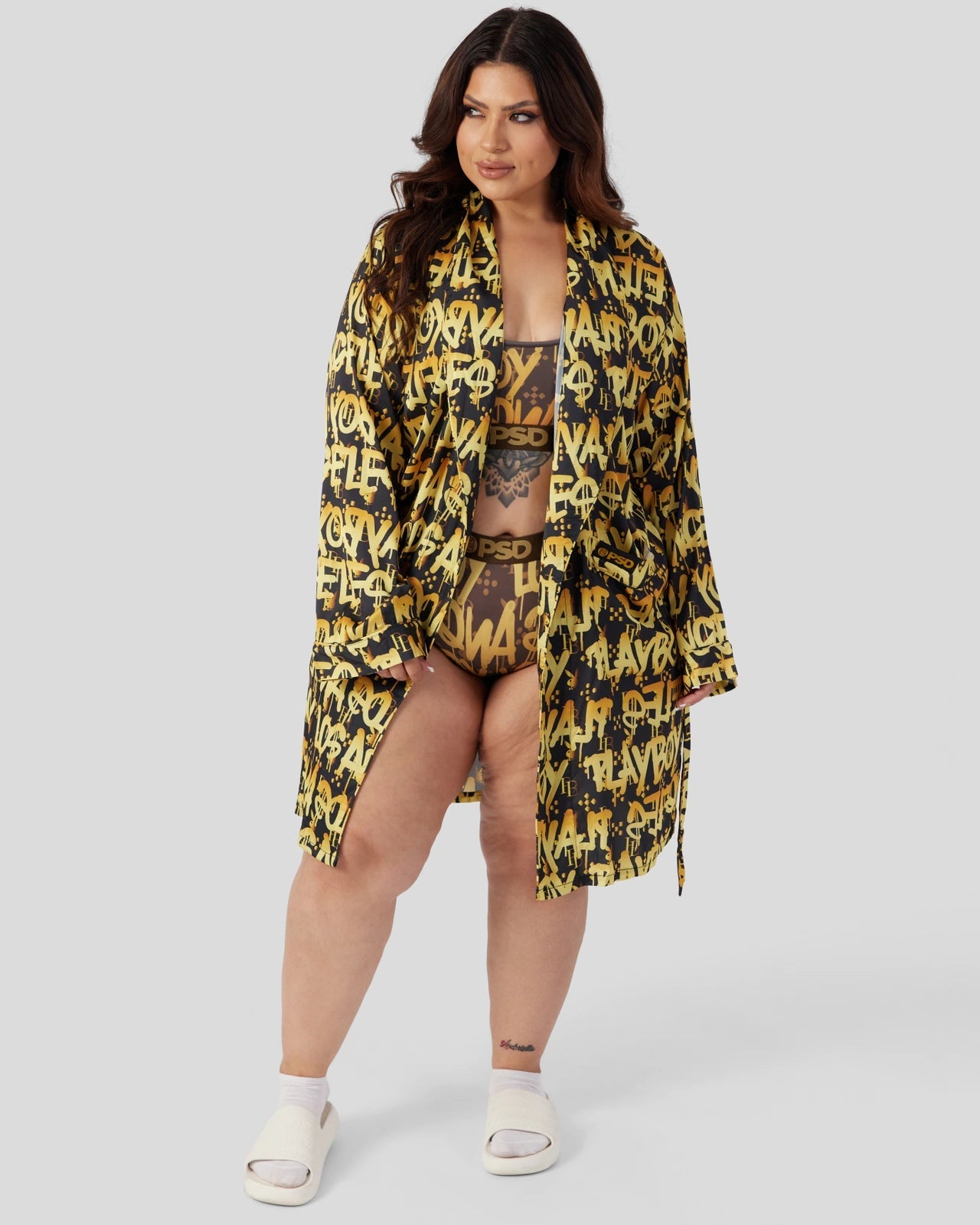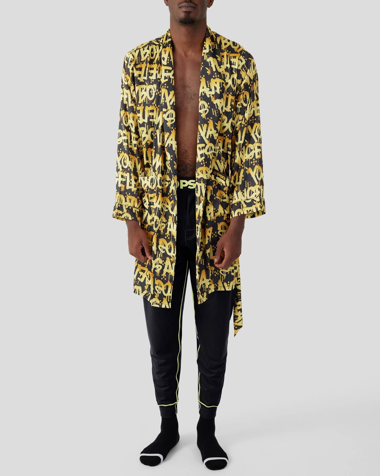 Feel like you’re lounging in luxury in our unisex Robe. Made of a satin-based. silky fabric. it features a classic silhouette with a shawl collar. adjustable or removable belt. and two front pockets.