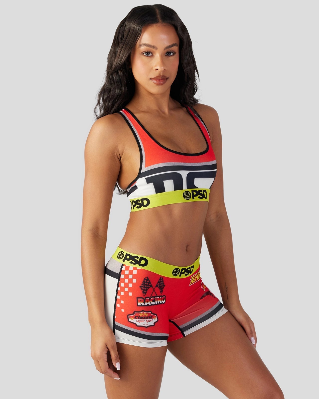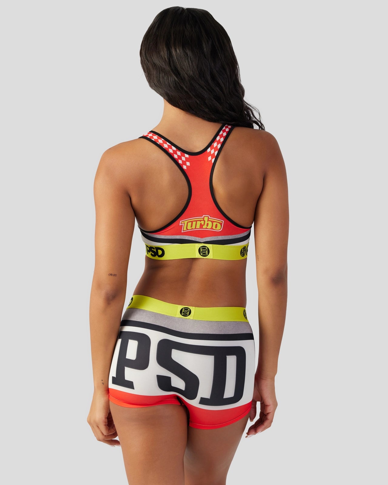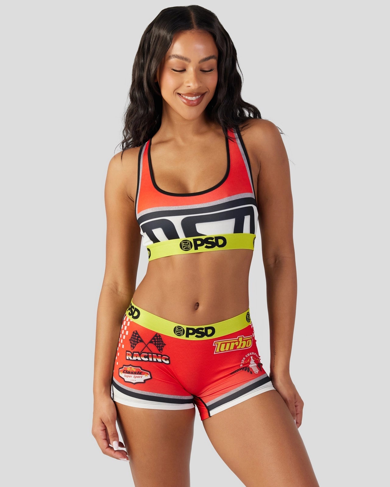 Get ready to turbocharge your look with this racing-inspired pair. The Turbo Race Sports Bra is made from a silky poly blend with a comfortable full coverage. keep-you-in fit. The PSD boy shorts are perfect for everyday wear and working out.