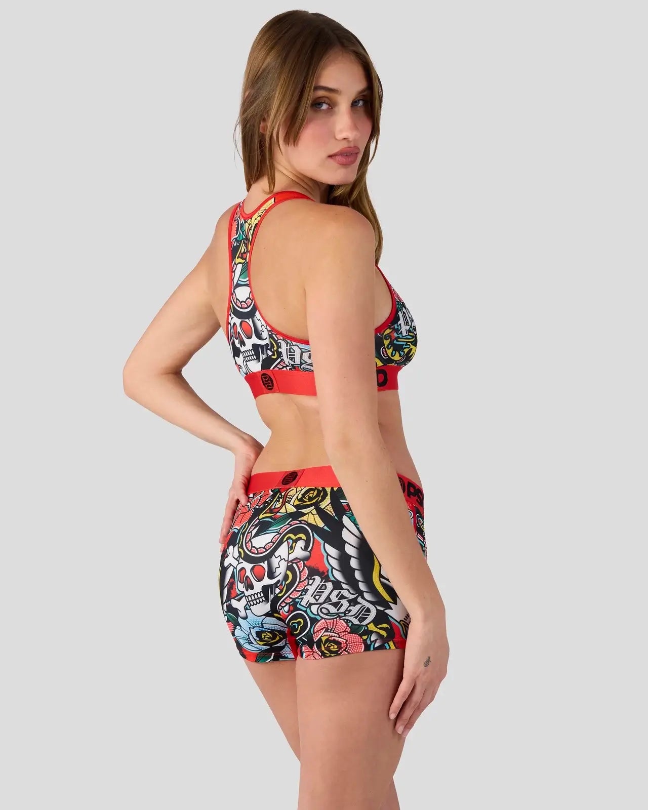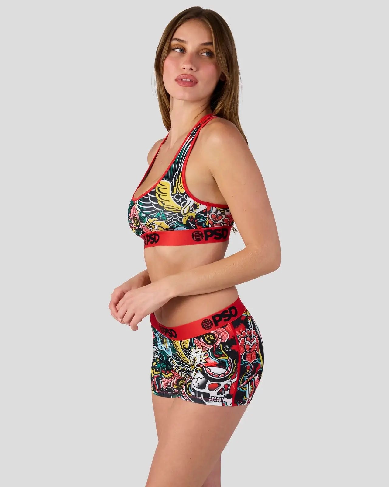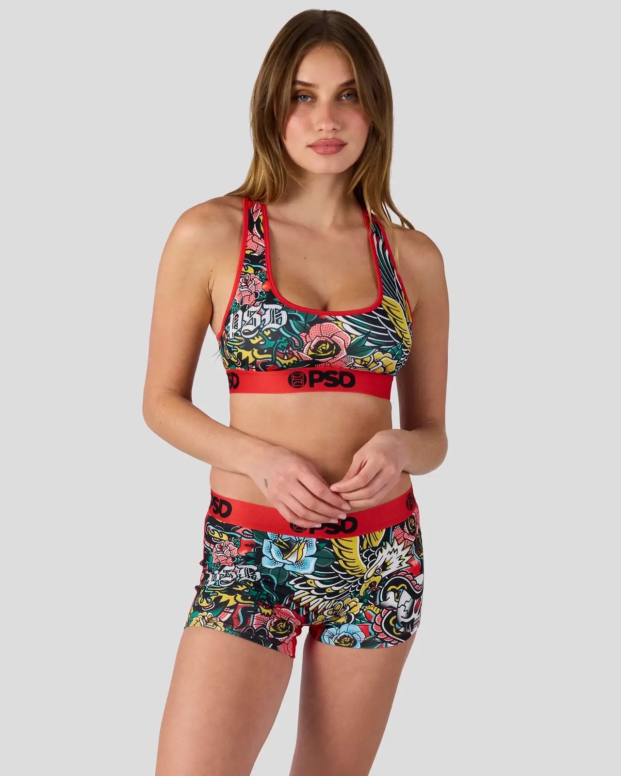 This fierce. tattoo-inspired look is channeling early-2000s edge. The Winged Spirit Boy Short is made from a silky poly blend with a comfortable full-coverage. keep-you-in fit. The PSD boy shorts are perfect for everyday wear and working out.